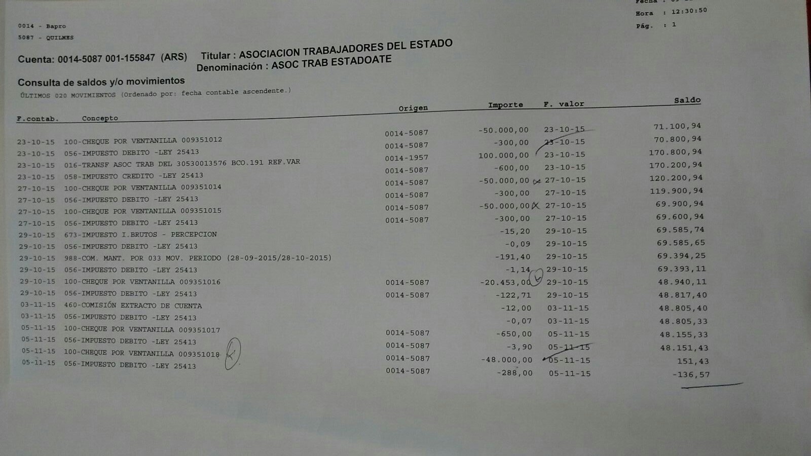 Según se desprende del resumen de los movimientos de la cuenta que tiene la seccional en el Banco Provincia, entre el 23 de octubre y el 5 de noviembre (último día de la gestión saliente) se registraron extracciones por 228 mil pesos lo que dejó la cuenta con una deuda de 136 pesos.