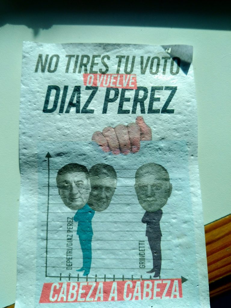 Con la marca del Gobierno, se vieron una serie de volantes que dice que los comicios están «cabeza a cabeza» pero el candidato del Frente de Todos tiene una cabeza extra, la del ex intendente Diaz Pérez.
