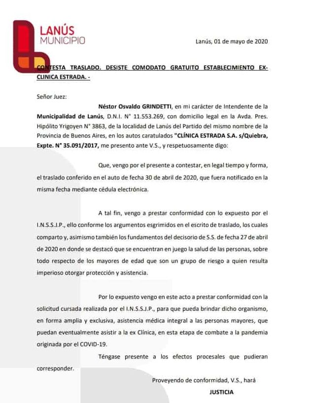Luego de varias idas y vueltas y ante la decisión del Municipio de desistir de su pedido, el Juzgado Civil y Comercial N°1 de Lanús decidió que PAMI se haga cargo de la Clínica Estrada y será utilizada para ampliar la cantidad de camas de atención para adultos mayores, en el marco de la crisis del Coronavirus.