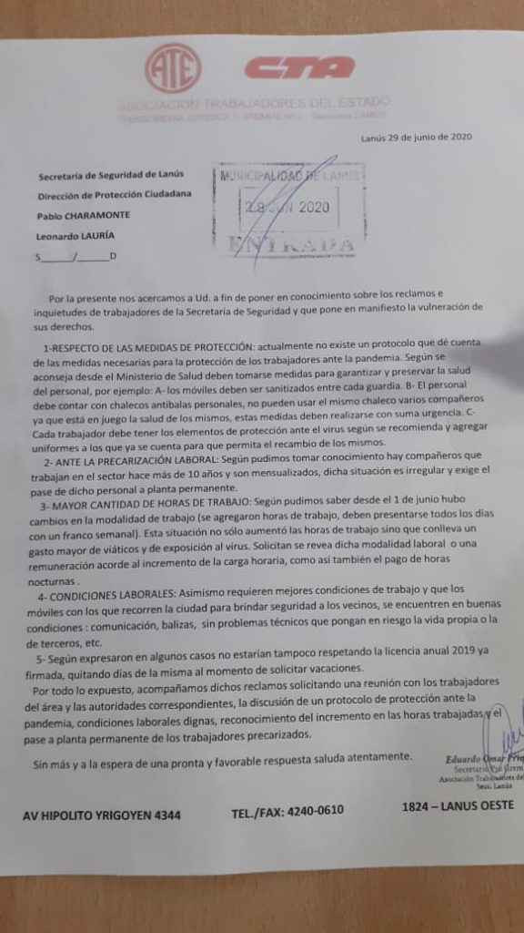 En una nota presentada esta mañana, solicitaron una serie de medidas para evitar contagios. Entre ellos la desinfección constante de los móviles; garantizar un chaleco anti balar a cada personal y que no se compartan; así como los elementos mínimos de protección (barbijos y alcohol sanitizante).