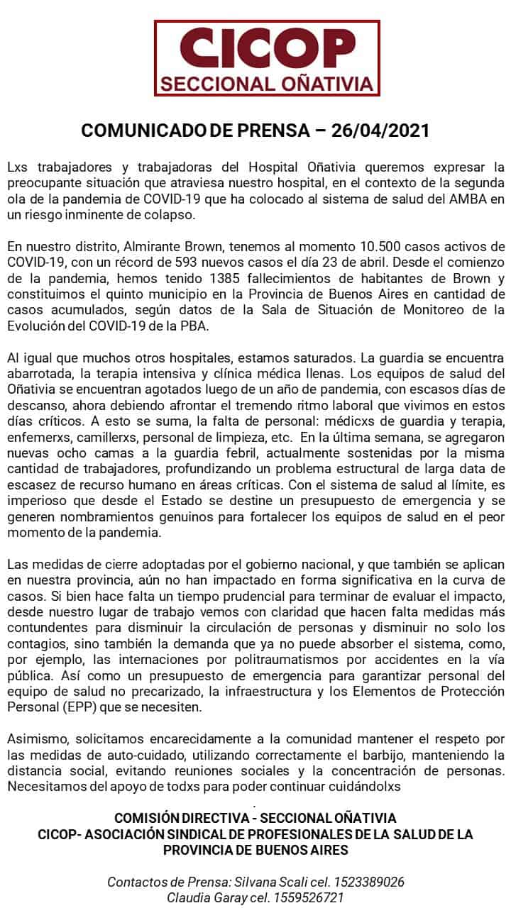 El lunes en un comunicado de prensa realizado por la seccional local de CICOP, los profesionales médicos describían una situación más que preocupante en el nosocomio: «La guardia se encuentra abarrotada, la terapia intensiva y clínica medica llenas. Los equipos de salud del Oñativia se encuentran agotados tras un año de pandemia, con escasos días de descanso, ahora debiendo afrontar el tremendo ritmo laboral que vivimos en estos días críticos. A eso se suma la falta de persona«, señalaron en el escrito y explicaron que «en la última semana, se agregaron ocho nuevas camas de guardia febril, actualmente sostenidas por la misma cantidad de trabajadores, profundizando un problema estructural de larga data de escasez de recurso humano«.