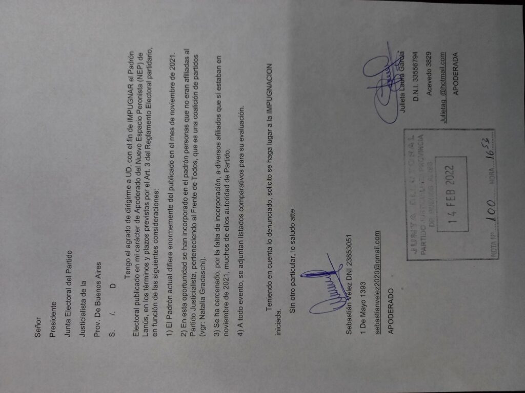 Integrantes de las agrupaciones NEP, FREJULA Y 62 Organizaciones Peronistas presentaron una impugnación ante la Junta Electoral del Partido Justicialista, por el padrón que presentaron las autoridades del Comité de Distrito de Lanús.