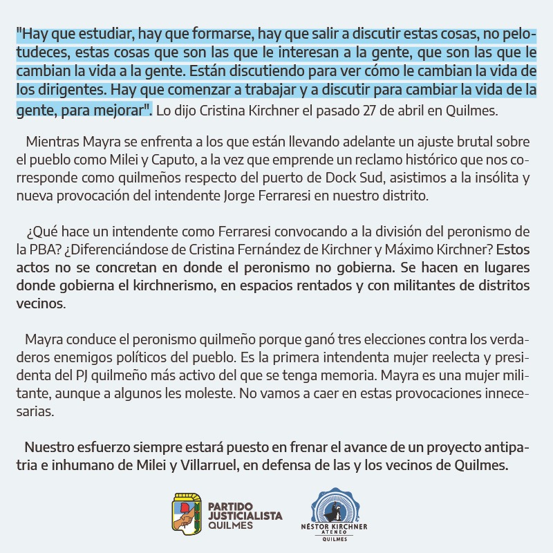 El comunicado luego expresa: “Mientras Mayra se enfrenta a los que están llevando adelante un ajuste brutal sobre el pueblo como Milei y Caputo, a la vez que emprende un reclamo histórico que nos corresponde como quilmeños respecto del puerto de Dock Sud, asistimos a la insólita y nueva provocación del intendente Jorge Ferraresi en nuestro distrito”.