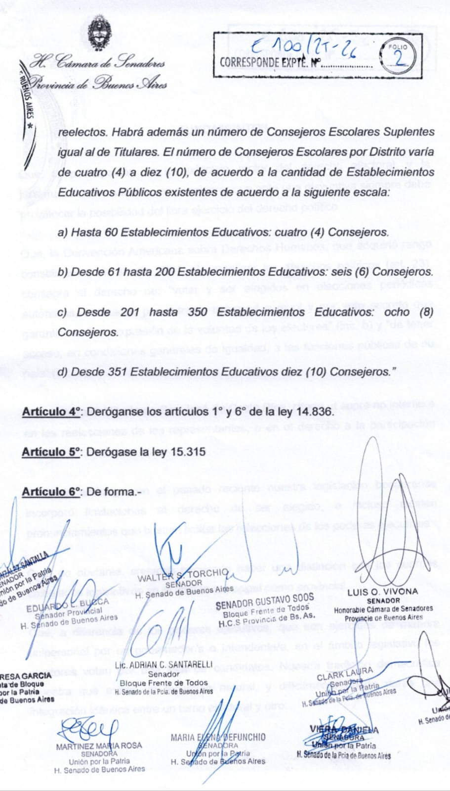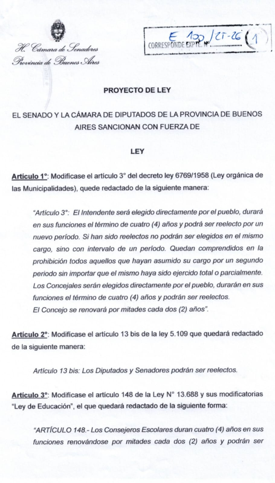 Este martes, después de que se diera media sanción a la suspensión de las PASO, ingresó en el Senado de la provincia de Buenos Aires un proyecto para modificar la ley impuesta durante el gobierno de María Eugenia Vidal y acompañada por el Frente Renovador, que pone un tope de dos mandatos consecutivos para la reelección de intendentes, legisladores provinciales, concejales y consejeros escolares.