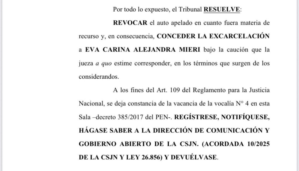La Cámara Federal de San Martín resolvió revocar el rechazo a la apelación del encarcelamiento de Eva Mieri y concederle la libertad “bajo la caución que la jueza a quo estime corresponder, en los términos que surgen de los considerandos”.