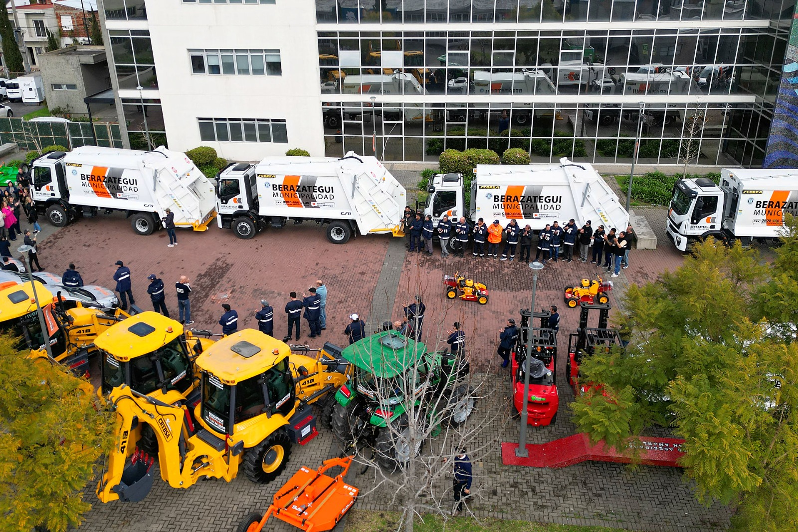 La Municipalidad de Berazategui presentó 35 nuevas unidades móviles que se incorporan a la flota vehicular de las Secretarías de Obras Públicas, Control Urbano, Servicios Públicos, y Desarrollo Social, Recreación, Turismo y Deportes. Estas flamantes unidades, que van desde tractores y camiones recolectores hasta motos y desmalezadoras, fueron adquiridas con fondos municipales.