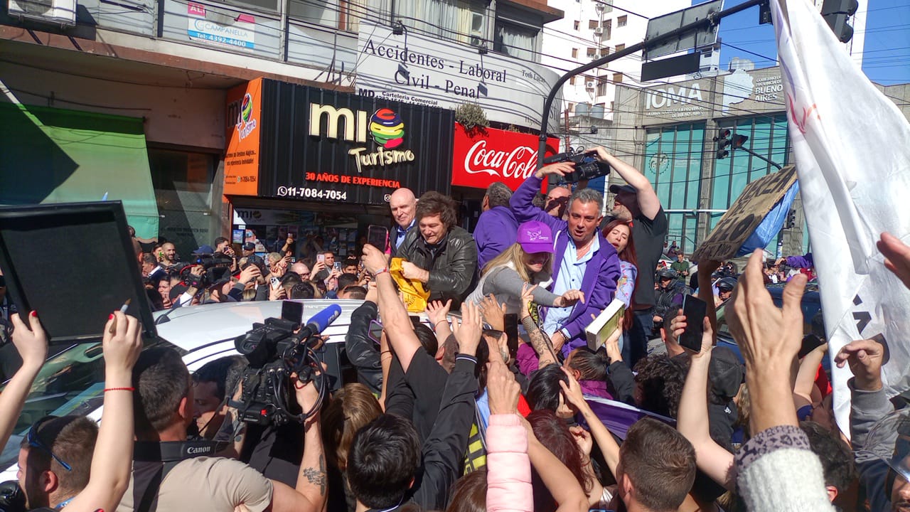En una jornada que se preveía tensionada y con los ánimos caldeados desde que se conoció la noticia, el mandatario nacional llegó cerca de las 15 horas a recorrer dos cuadras de las tres que tenía planificada, a bordo de una camioneta con su ya mencionada hermana, los candidatos Maximiliano Bondarenko (a diputado provincial) y José Luis Espert (a diputado nacional) y el armador bonaerense Sebastián Pareja, donde fueron recibidos por más de un centenar de simpatizantes.