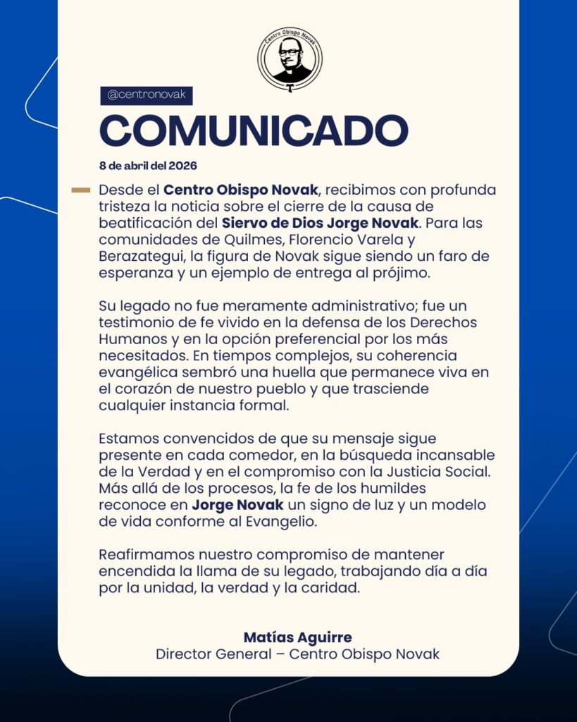«Recibimos con dolor la decisión comunicada desde las instancias eclesiásticas correspondientes. Para quienes caminamos junto a él y para el pueblo de la Diócesis, Novak no solo fue un guía espiritual, sino un pilar fundamental en la defensa de los Derechos Humanos durante los años más difíciles de nuestro país. Su voz, que se alzó valiente en soledad contra la injusticia y el terrorismo de Estado, es un patrimonio moral que trasciende cualquier proceso administrativo», afirmaron.